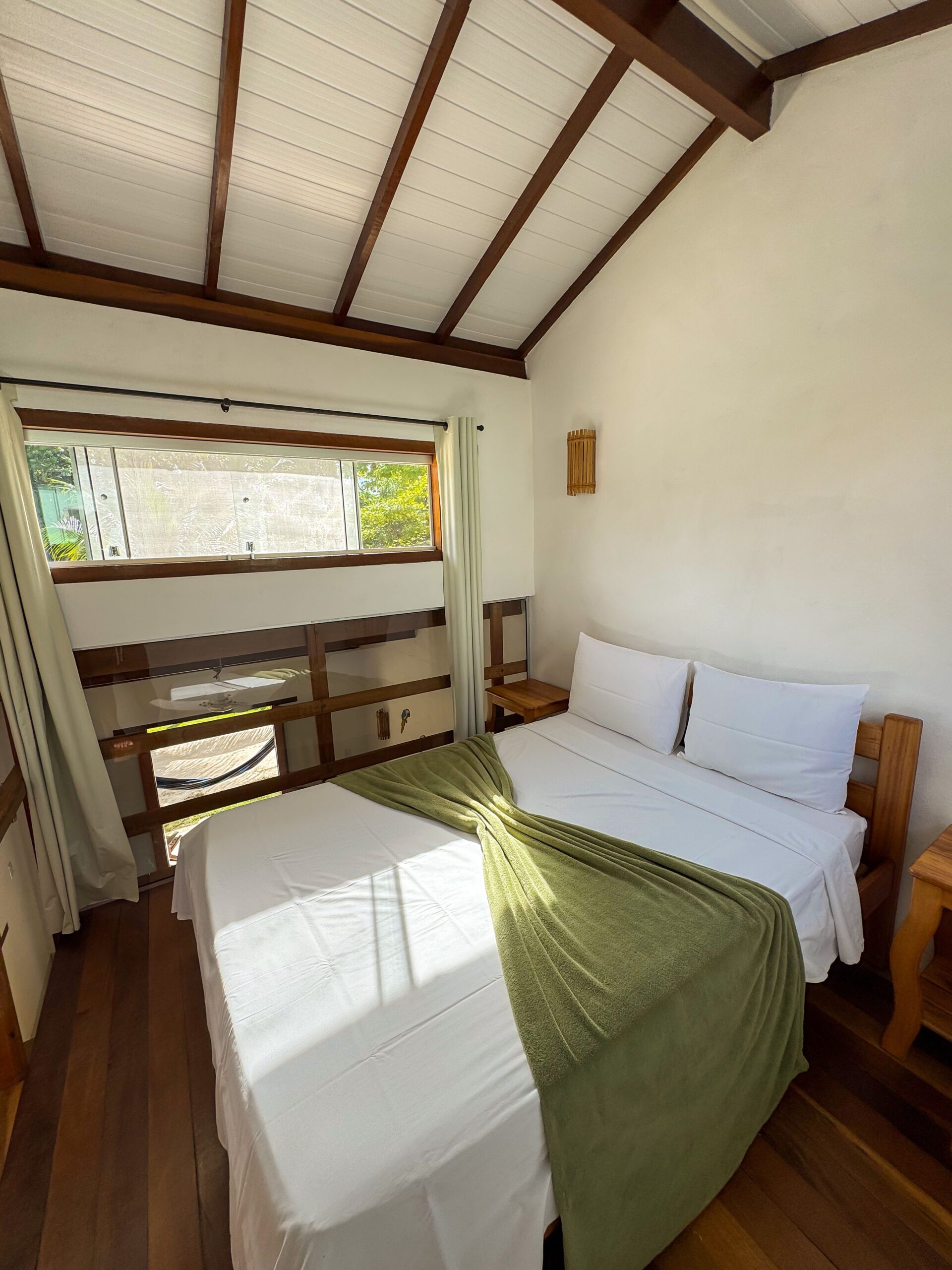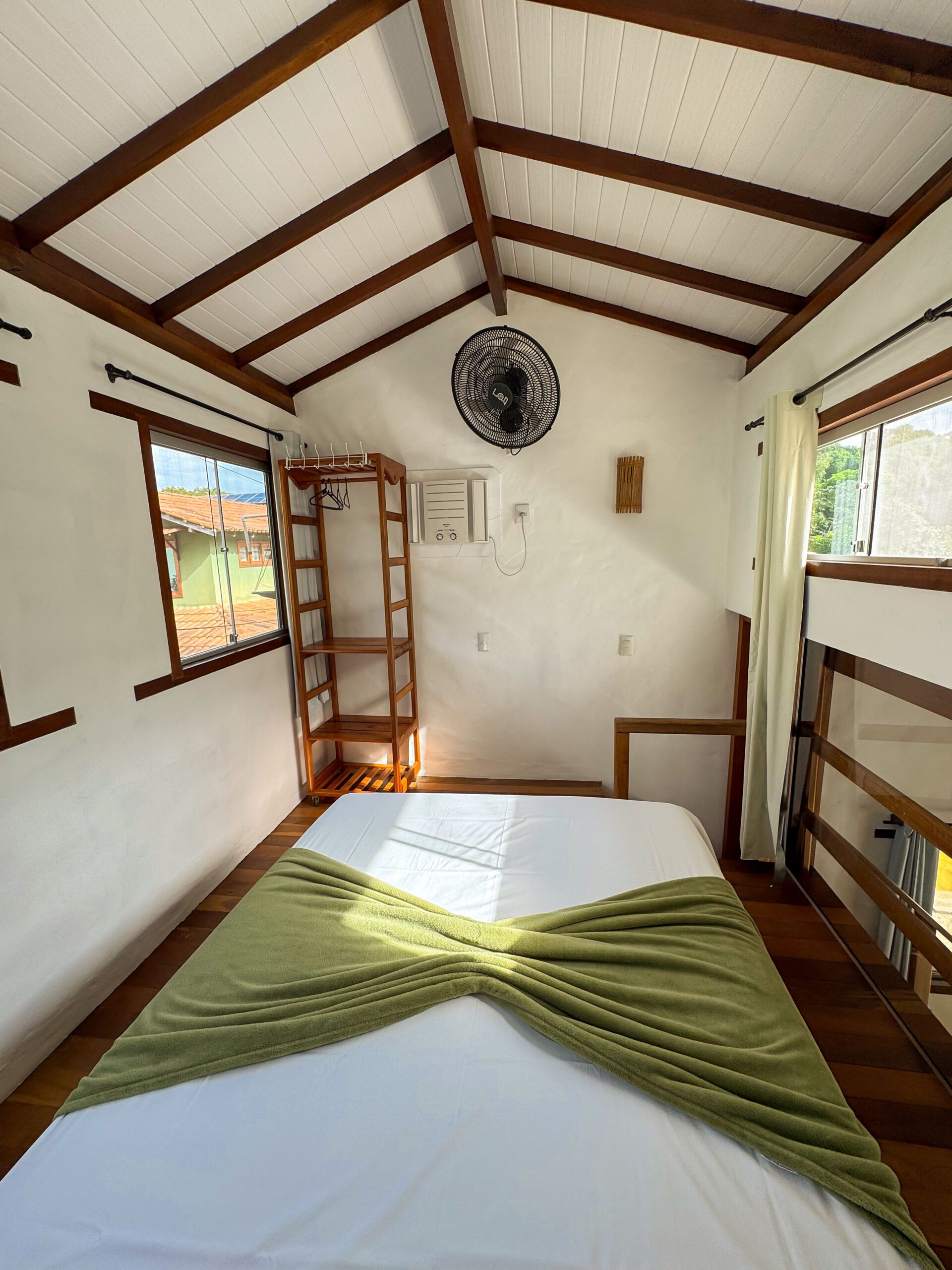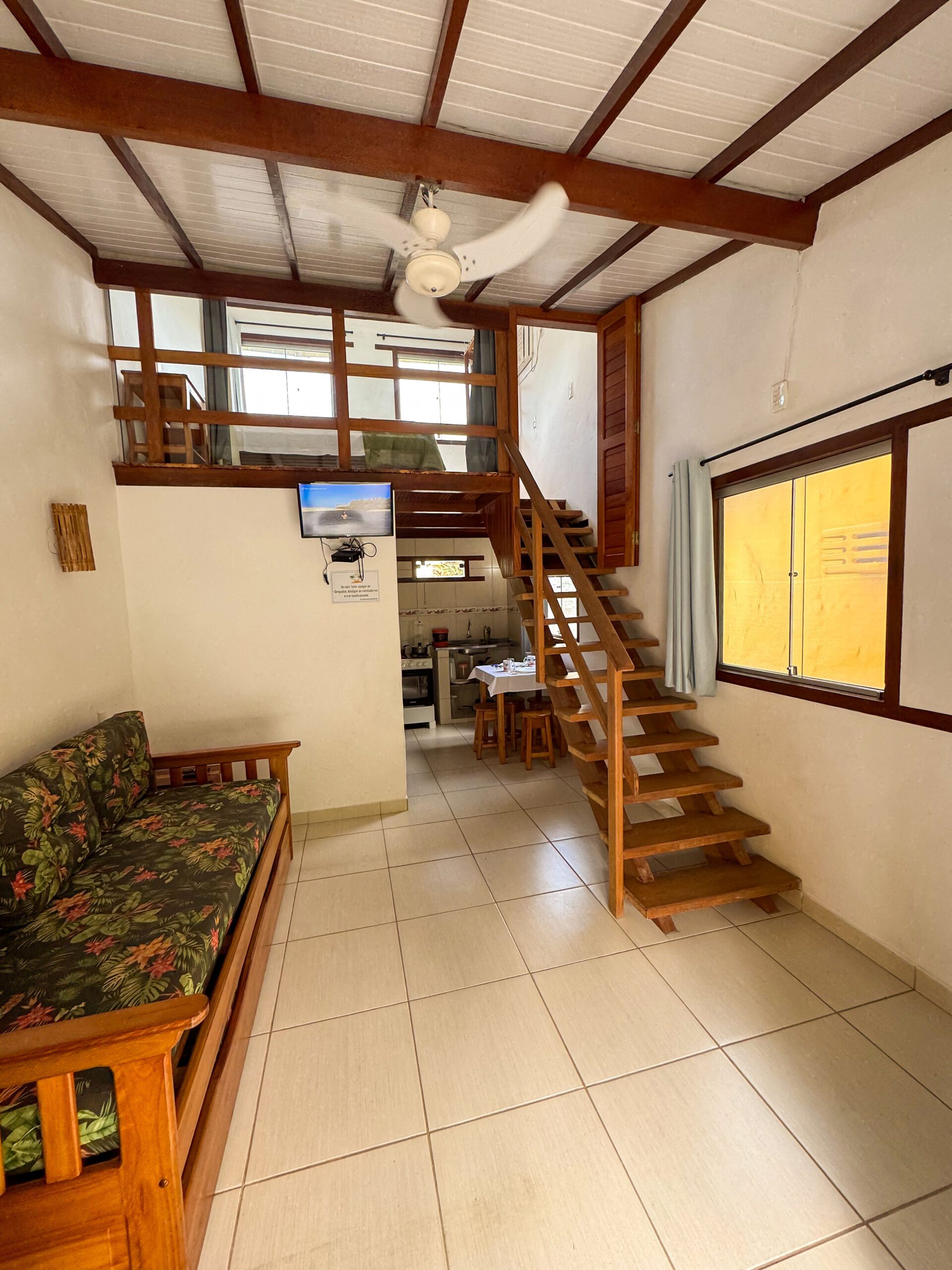 Acomoda confortavelmente até 4 pessoas, com um quarto equipado com cama de casal, ar condicionado para as noites quentes e ventilador de teto para uma brisa suave. A sala oferece uma prática bi-cama com colchões ortopédicos, garantindo um descanso de qualidade para mais dois hóspedes, além de um ventilador de teto.